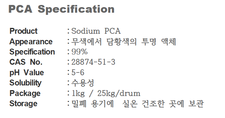 소듐 피씨에이(Sodium PCA)는 피부와 모발에 강력한 보습 효과를 주는 화장품 원료로, 피부의 천연보습인자(NMF) 성분의 일부이며 공기 중의 수분을 끌어당겨 피부에 수분을 공급하고 유지하는 역할을 합니다. 끈적임 없이 산뜻하게 흡수되면서 윤기와 부드러움을 부여하며, 글리세린보다 뛰어난 보습력을 자랑하는 수용성 성분입니다.